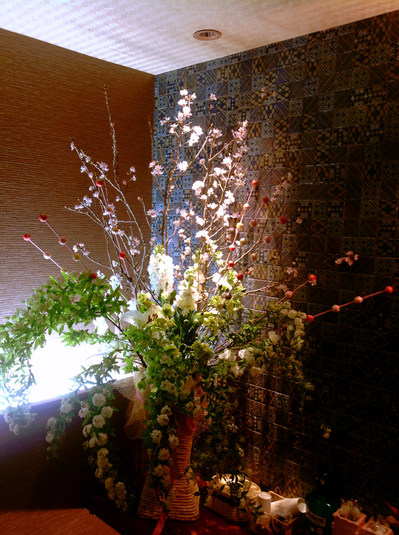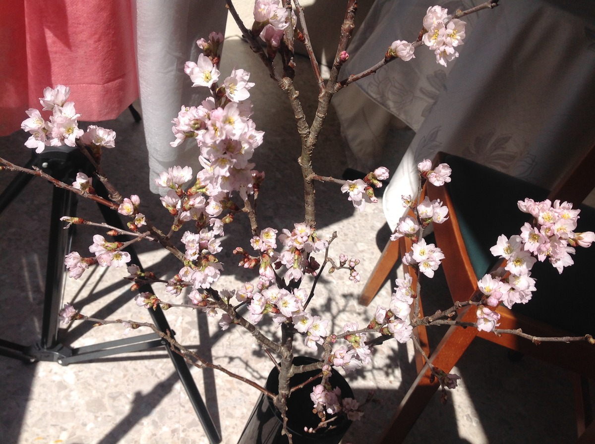 昨日、笑い屋のトイレに活けた桜とコデマリが一日で咲いてきました、、、。