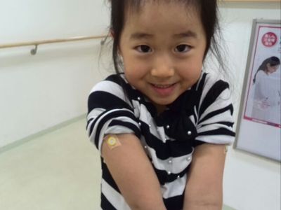 こちらは、先日、予防接種両手打ち泣かずに頑張ったよ!のポーズ。