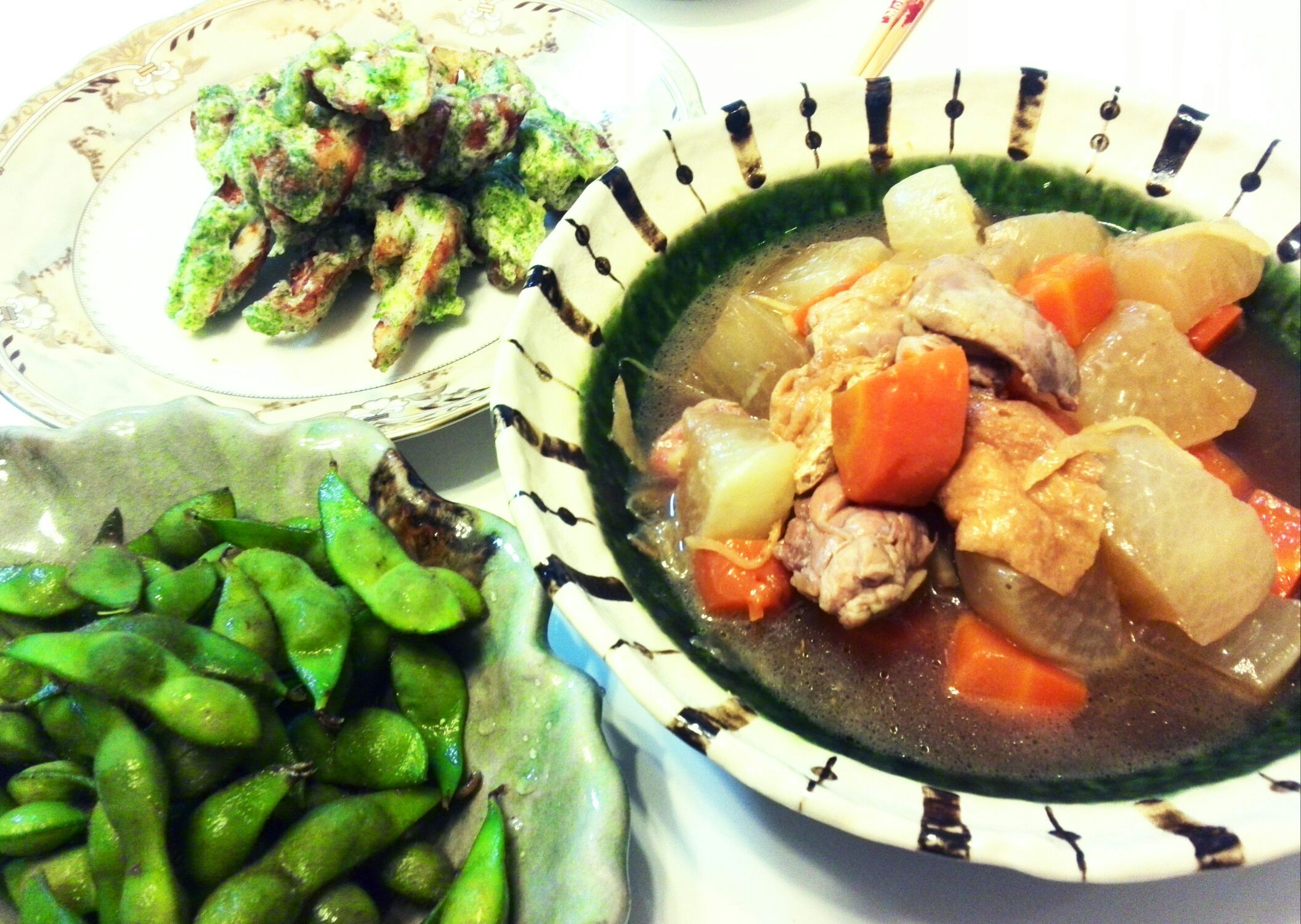 ちくわの磯辺揚げ 紫ずきん 大根と鳥肉の生姜煮 あと、、おにぎり。娘はオレンジ、私は酒盗