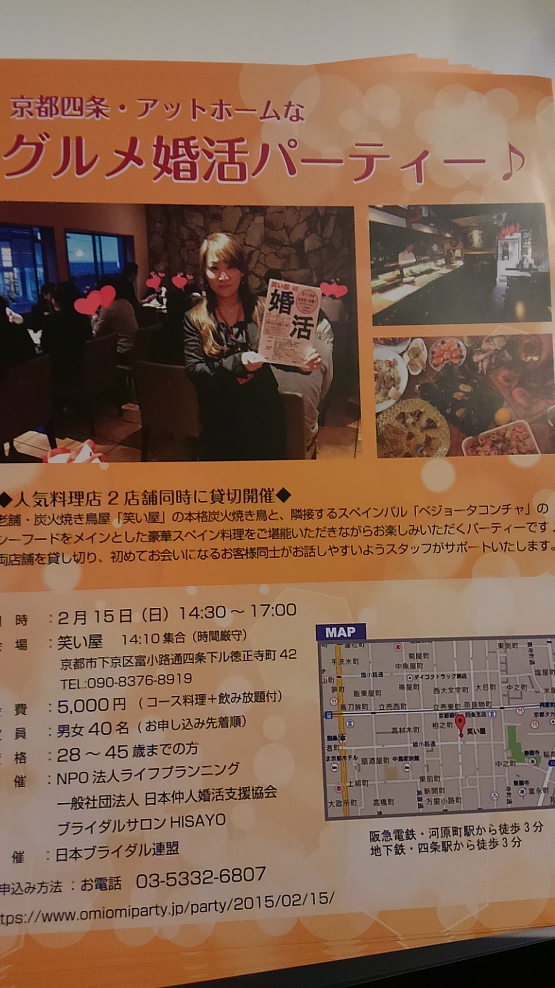 グルメ婚活 笑い屋 ホームコラム こんばんはー、京都 結婚相談所 ブライダルサロンHISAYO 松村です。 来月のパーティーのチラシとポスターができました!予想外の反響で女性は既に満席です、すいません。 男性はまだ募集中! 楽しい時間になりますようにスタッフも頑張りますね!(^_^)v どうぞよろしくお願いいたします。 三月の通常のパーティーもございますので合わせてよろしくお願いいたします!日程はまたホームページで発表いたします!(^_^)v