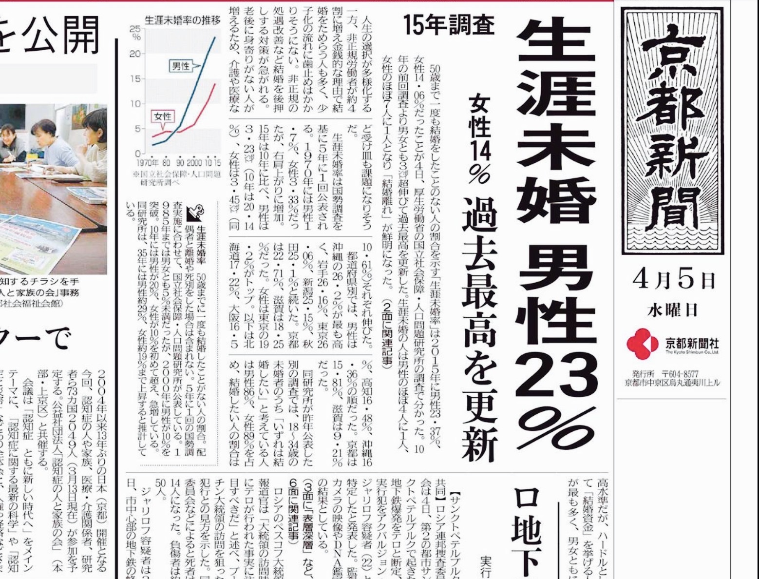 生涯未婚率、全力平均を上回るという不名誉なワースト順位だった京都ですが